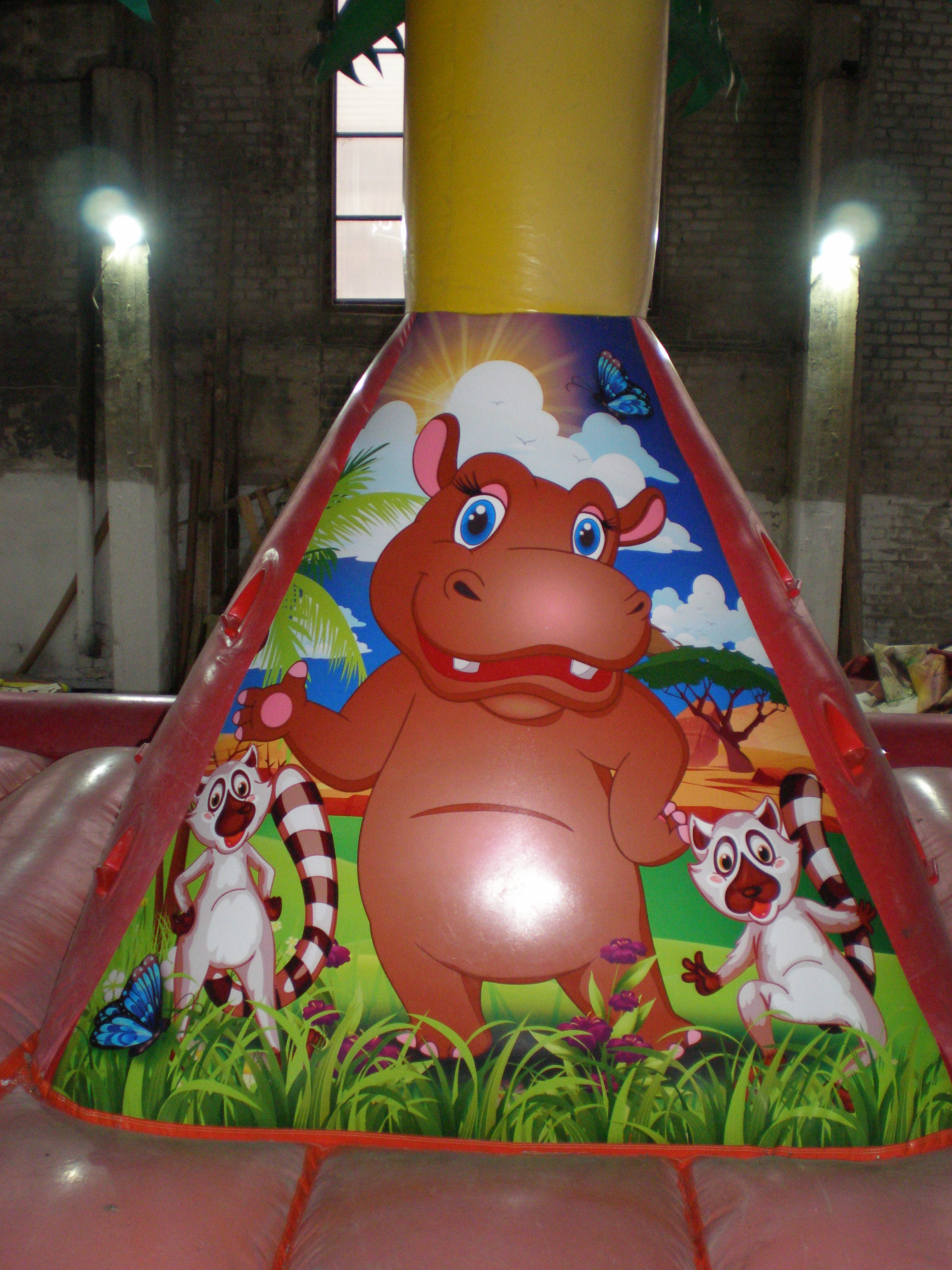 Локальный ремонт с подбором цвета и печатью нового изображения. Структура батута не пострадала.