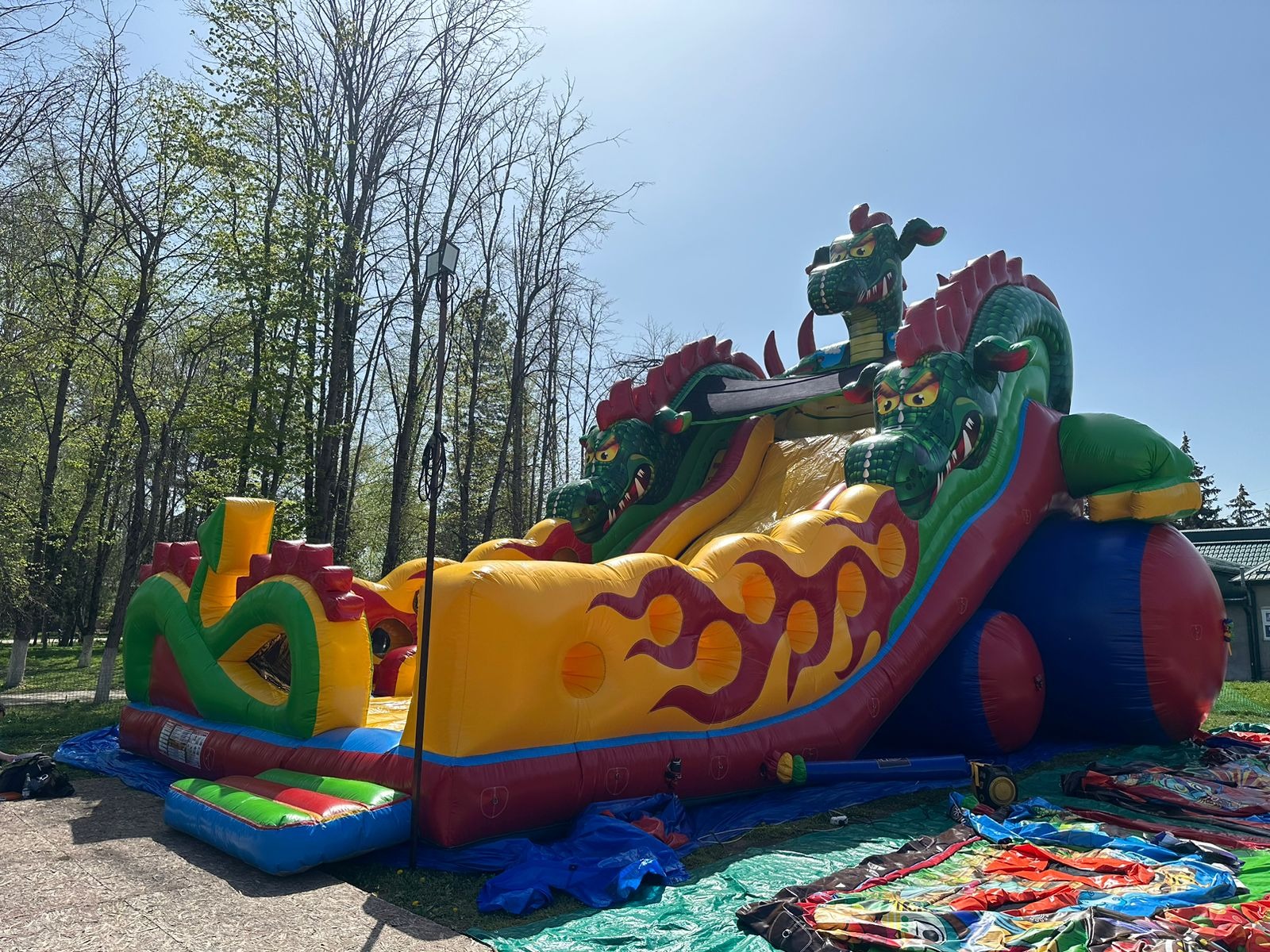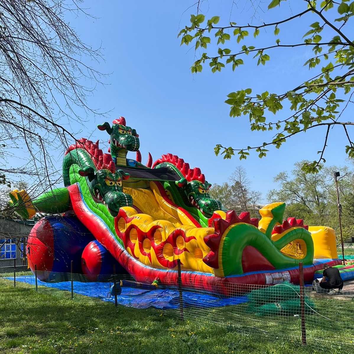 Конструкция аттракциона продумана для безопасности на высоких скоростях: расширенная зона торможения у основания горки позволяет безопасно завершить спуск даже при сильном разгоне. Как и все наши продукты, «Змей Горыныч» изготовлен с запасом прочности: ПВХ 650 г/м² (в 2 раза превышает ГОСТ), швы на лавсановых нитях (разрывная нагрузка 16 кг) и встроенная дренажная система.