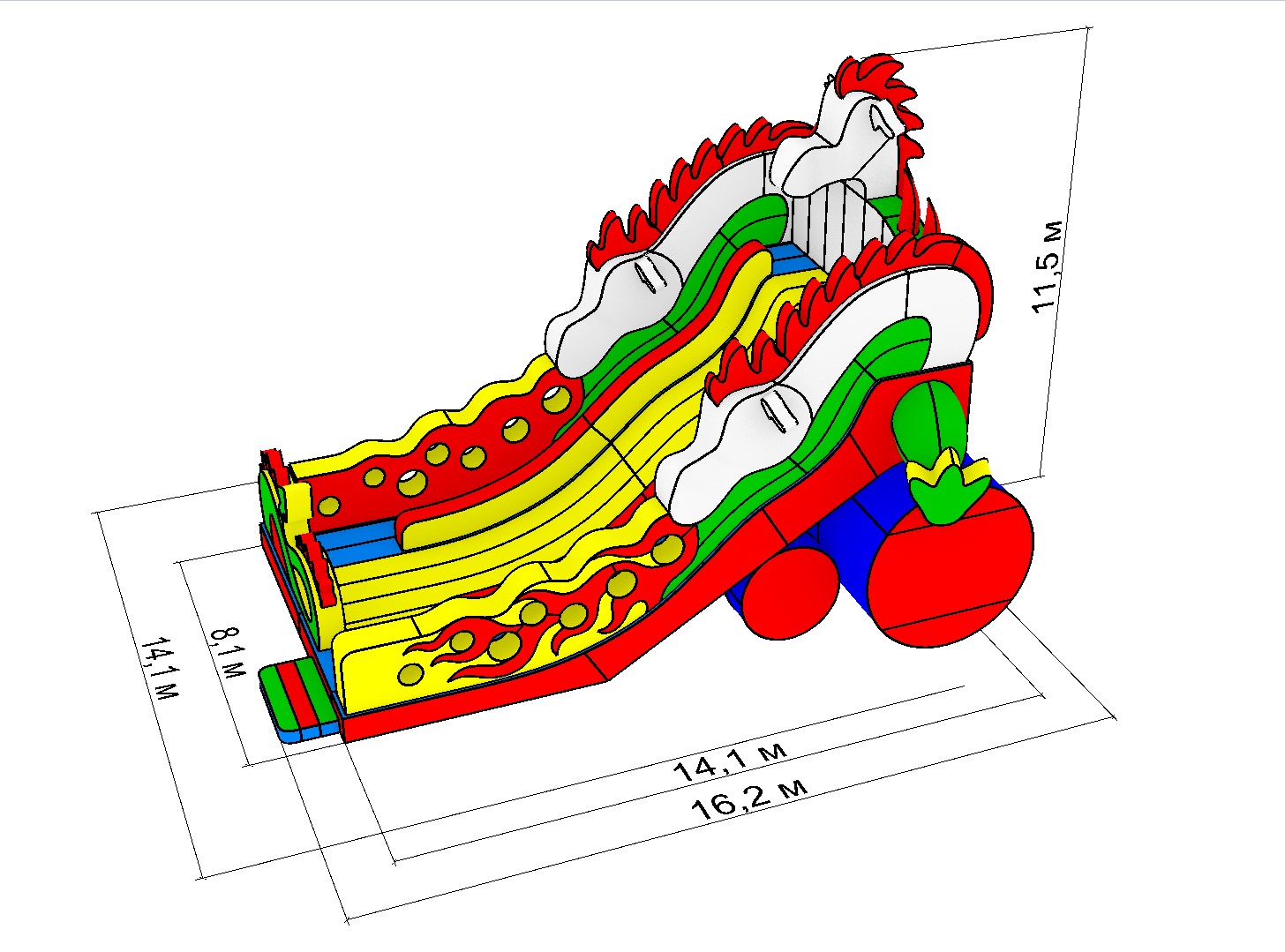 Надувная горка «Змей Горыныч» - это флагманский аттракцион, создающий «вау-эффект» и притягивающий взгляды. Его главная особенность - рекордная общая высота (11.8 м) и высокая стартовая площадка горки (6 м), что обеспечивает один из самых длинных и захватывающих спусков на рынке. Это идеальный выбор для создания центра притяжения в крупных парках развлечений, на фестивалях и в аквазонах.